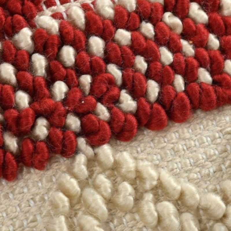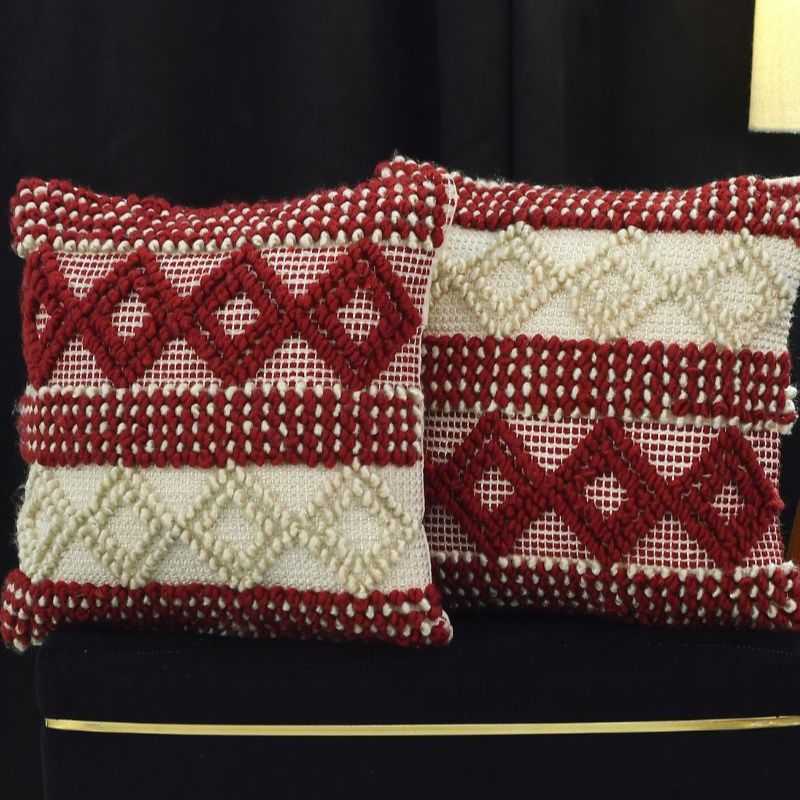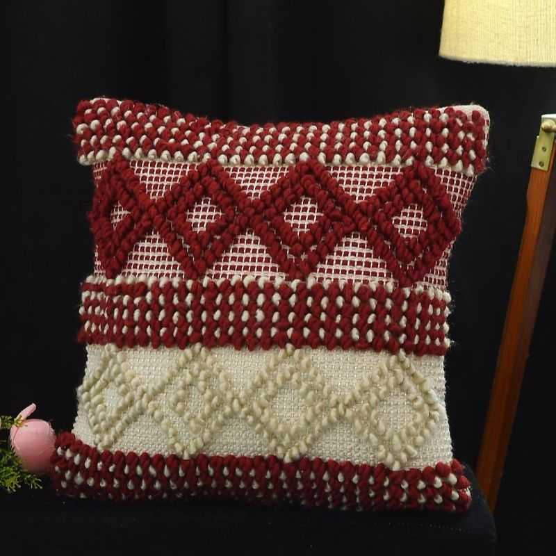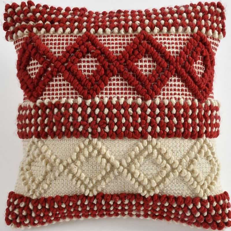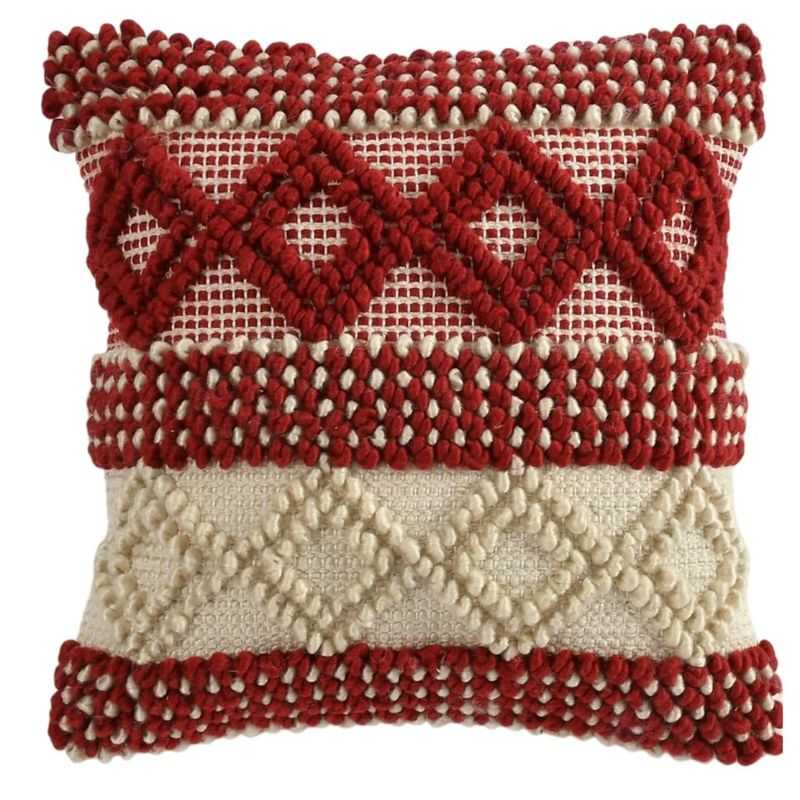Elevate your home décor with this exquisite Artisan Woven Accent Pillow. Each piece is lovingly handcrafted on a traditional pit loom, resulting in a uniquely textured 18x18 inch cushion. The striking red and cream geometric design, woven from high-quality cotton, adds a touch of artisanal elegance to any space. This throw pillow's distinctive texture and eye-catching pattern make it a perfect accent for your sofa, bed, or favorite reading nook. Experience the beauty of traditional craftsmanship with this stylish and comfortable cushion.