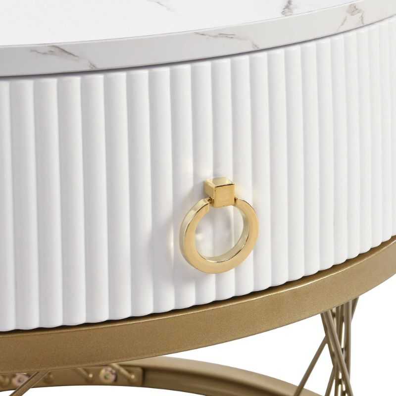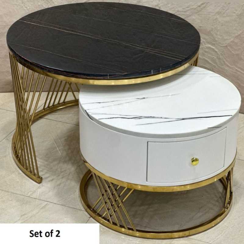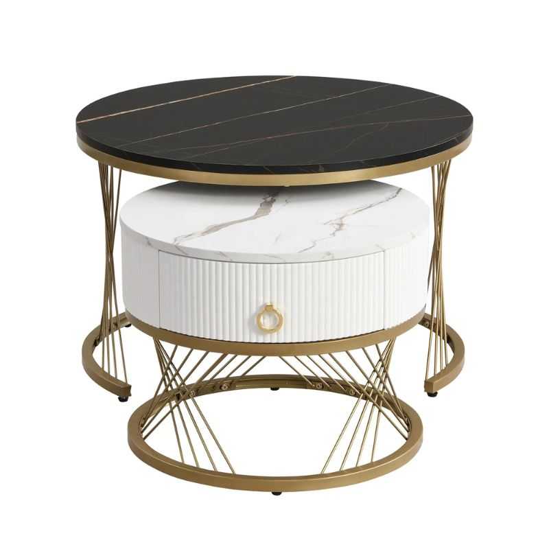 Elevate your living room with the Ismera Center Table by WoodEnsure, a perfect blend of modern luxury and functional design. This set of two nesting tables features a glossy black marble top and a white marble top with a convenient drawer, both framed in sleek gold with crisscross bases.