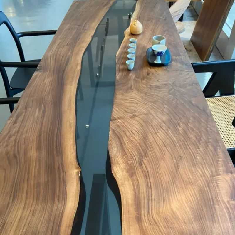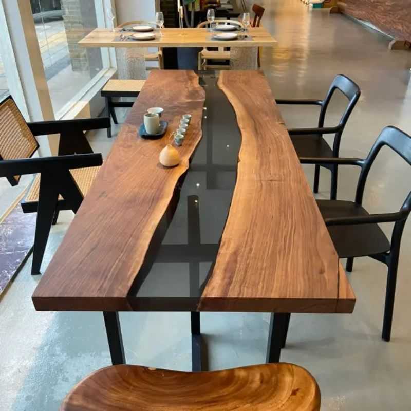 Crafted to impress, this 6-seater epoxy river dining table is a perfect fusion of solid acacia wood and premium craftsmanship. Featuring a bold black epoxy river running through rich natural live edge wood, it creates a stunning centerpiece for luxury homes and villas. The sturdy powder-coated steel legs offer balance and modern aesthetics, while the 72 x 36 x 30 inch dimensions make it spacious for family meals and elegant dinner parties. Built to last and easy to maintain, this handcrafted table brings warmth, sophistication, and functional beauty to your dining room.