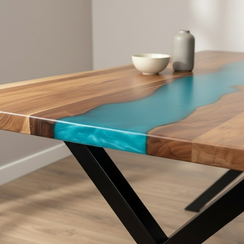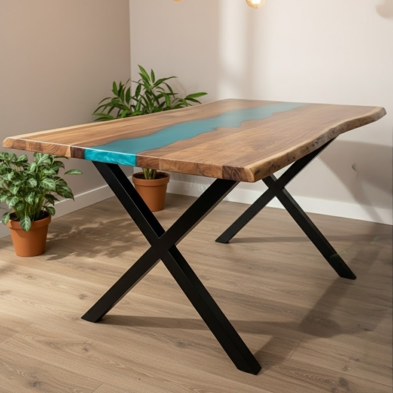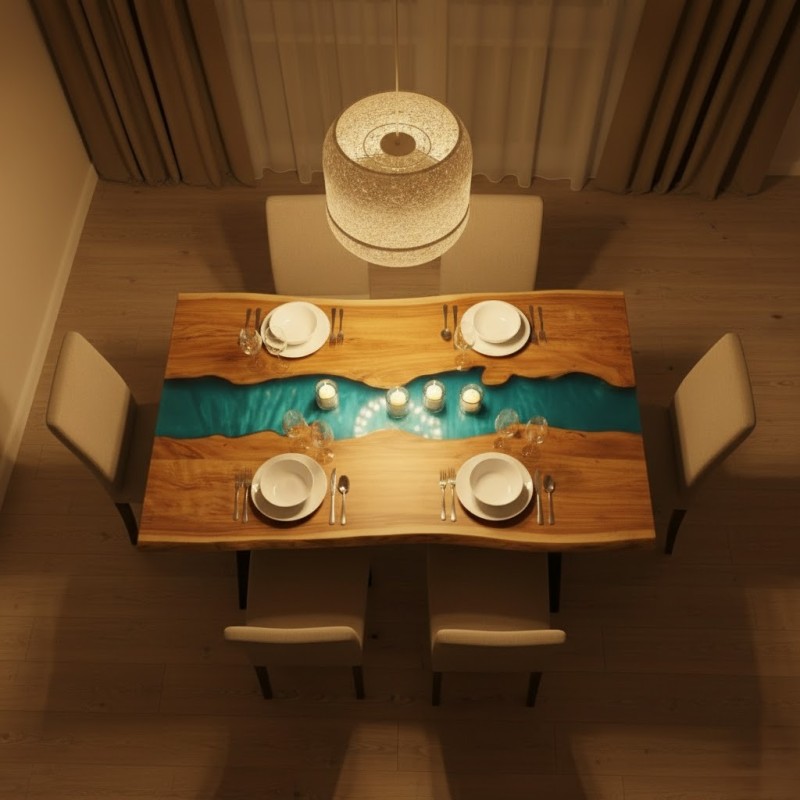 Ideal for families and gatherings, this affordable epoxy resin dining table comfortably seats six and complements both compact and spacious dining areas. Its solid wood structure ensures long-lasting strength, while the delicate resin detailing highlights the natural grain, making each table unique.