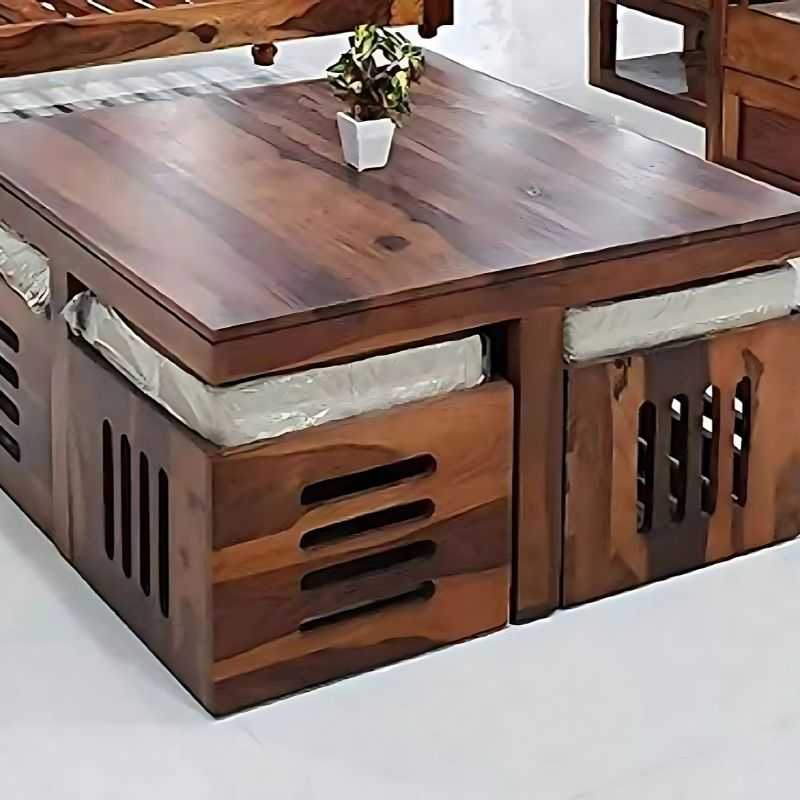 Transform your living space with this handcrafted solid Sheesham wood coffee table set, designed to combine elegance with everyday practicality. The square center table features a premium honey finish, paired with 4 integrated cushioned stools that double as storage boxes. A perfect pick for modern apartments, luxury villas, or compact homes seeking functionality with charm.