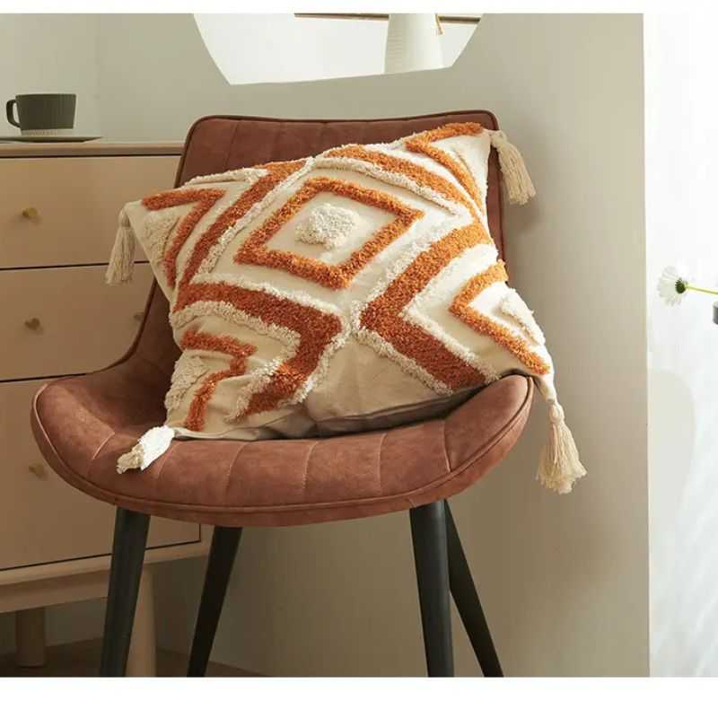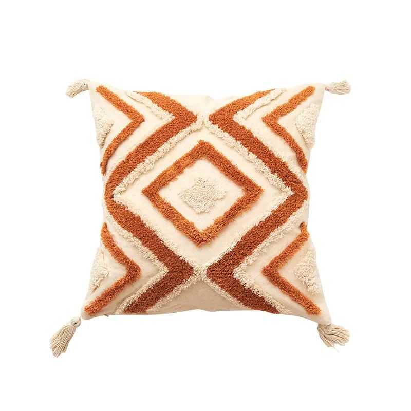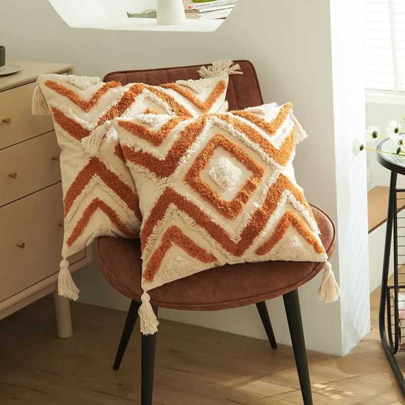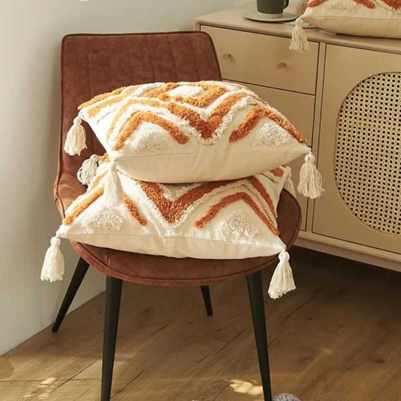 Add a boho vibe with the TerraWeave Throw Pillow set! These terracotta tufted pillows feature a geometric pattern and tassels, perfect for sprucing up your living room decor. Soft and stylish, they’re a must-have!