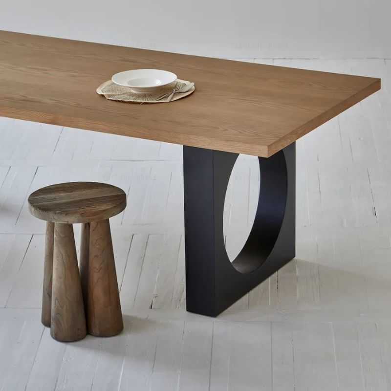 Bold Circular Cutout: Unique geometric design enhances modern dining aesthetics.