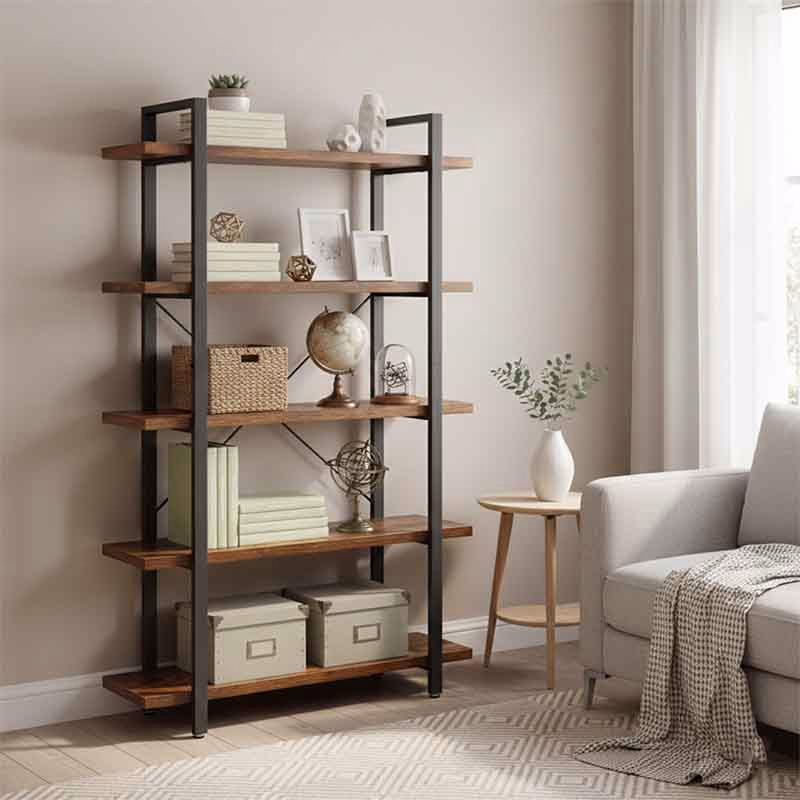 The angular bookshelf is crafted from premium solid wood shelves supported by a durable angular metal frame for strength and stability.