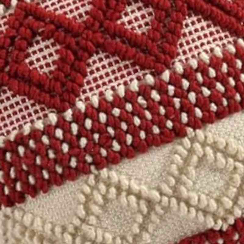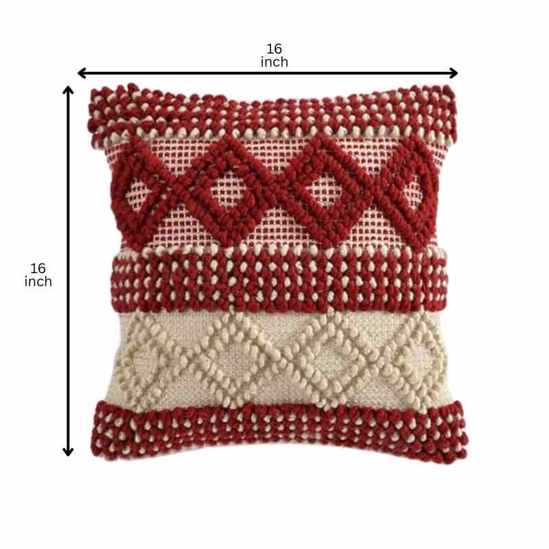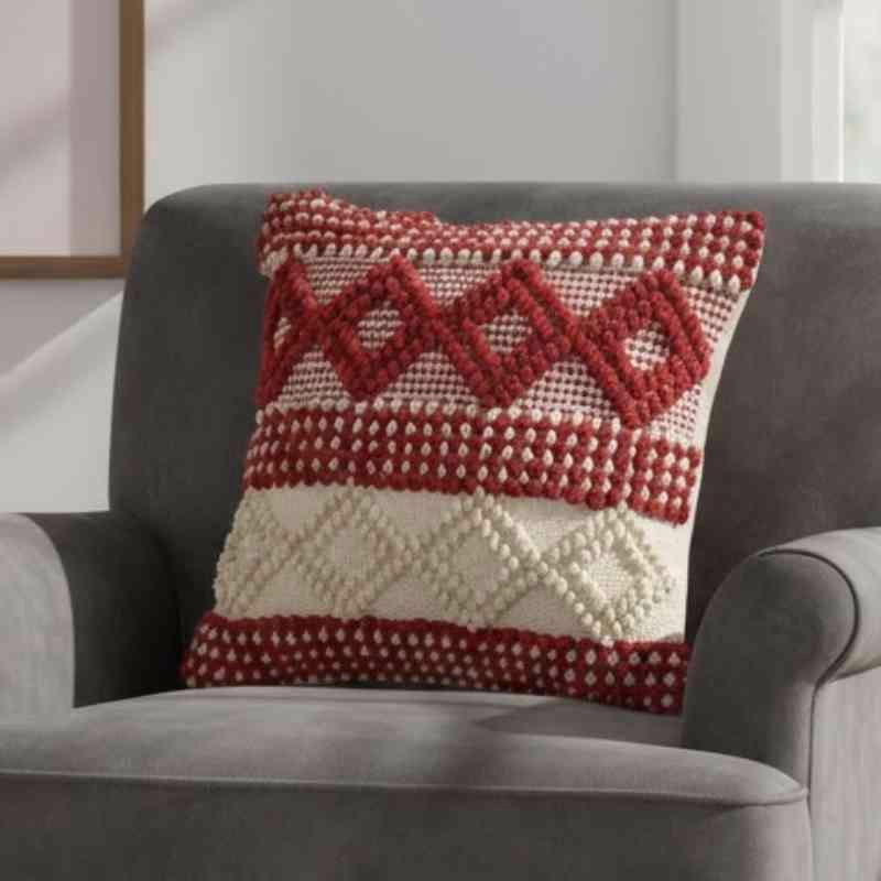 Elevate your home décor with this exquisite Artisan Woven Accent Pillow. Each piece is lovingly handcrafted on a traditional pit loom, resulting in a uniquely textured 18x18 inch cushion. The striking red and cream geometric design, woven from high-quality cotton, adds a touch of artisanal elegance to any space. This throw pillow's distinctive texture and eye-catching pattern make it a perfect accent for your sofa, bed, or favorite reading nook. Experience the beauty of traditional craftsmanship with this stylish and comfortable cushion.