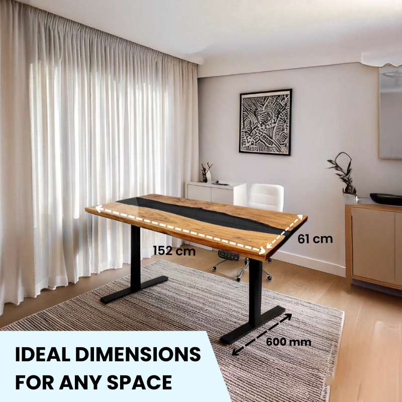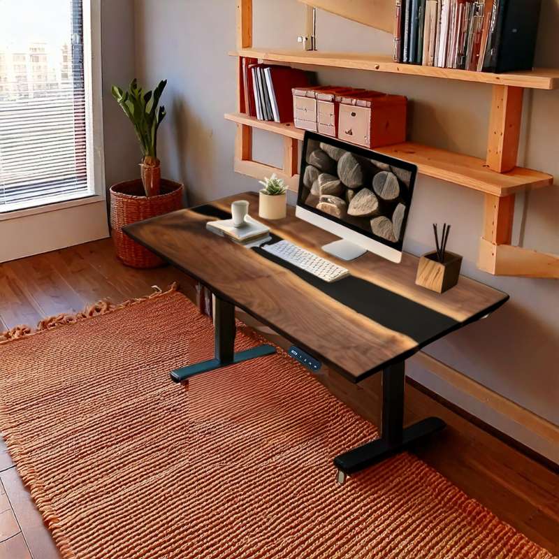 An extraordinary invention of a height adjustable table having a black opaque epoxy wood top with a river design will indeed attract everyone’s attention. Black opaque epoxy wood top makes it look elegant and contemporary, and the river on the product gives it an artistic and individualistic appearance. It has good heat and water resistance due to the epoxy resin used. Elegance and design flexibility allow for the inclusion of real epoxy river pebbles.