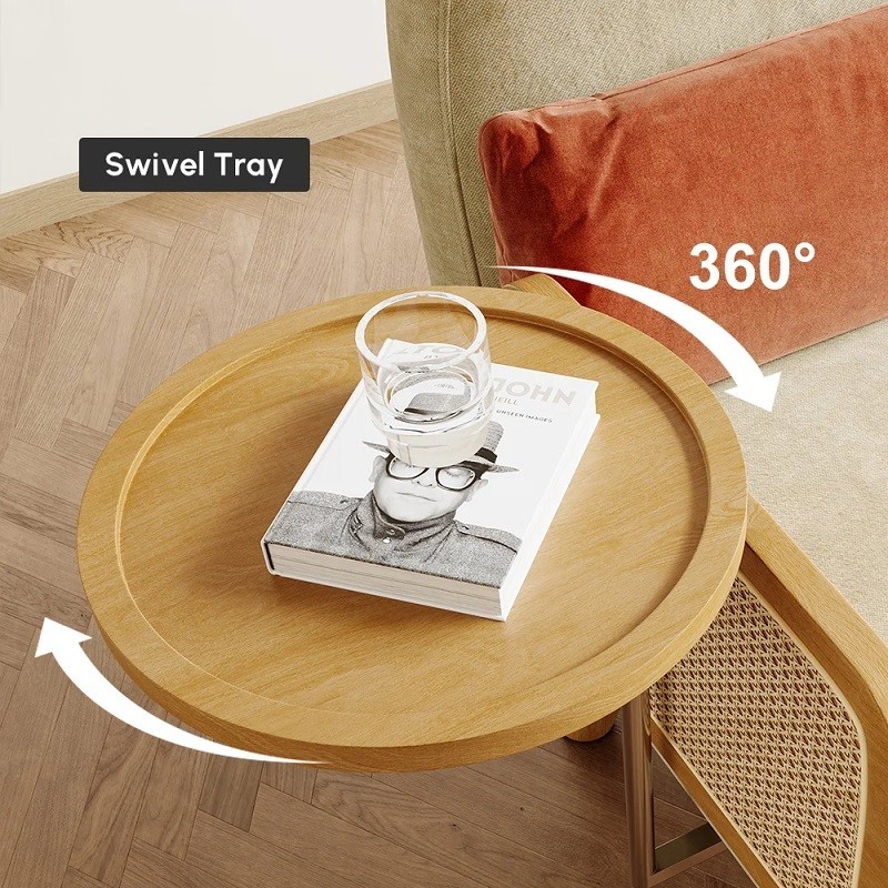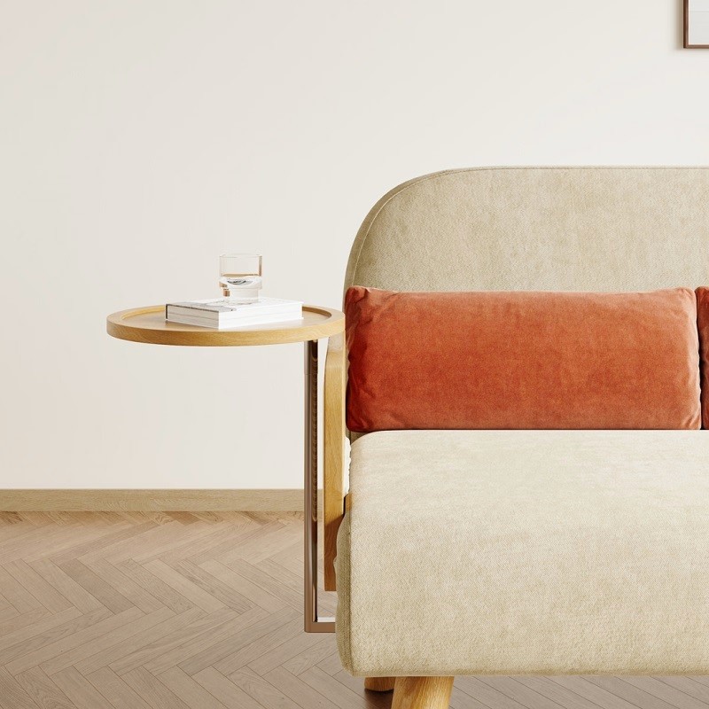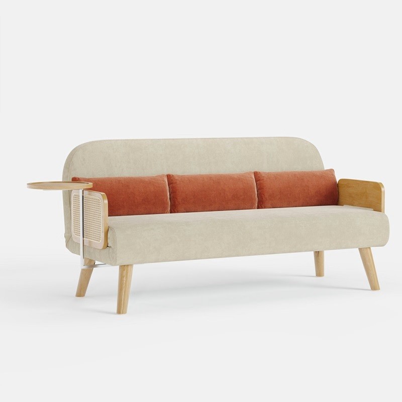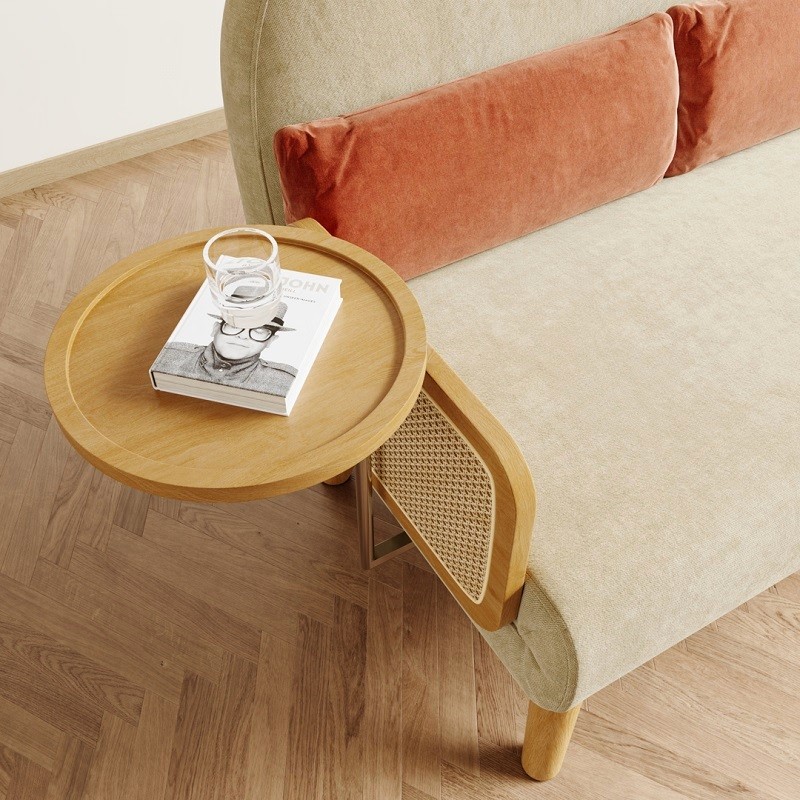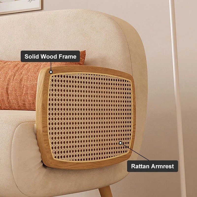 Designed with a sturdy wooden frame, natural rattan detailing, and soft beige upholstery, it offers durability along with a refined aesthetic. The integrated wooden side tray adds everyday convenience—ideal for keeping books, beverages, or décor within reach.