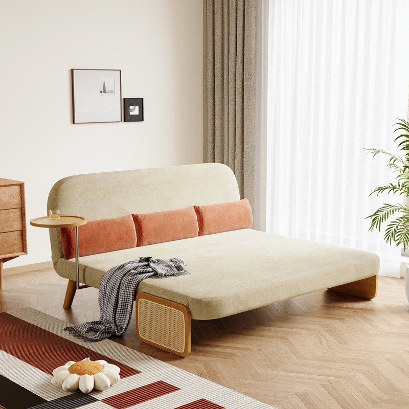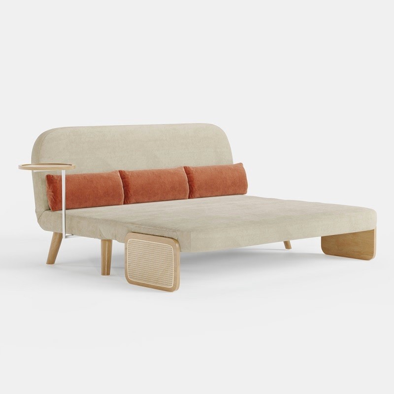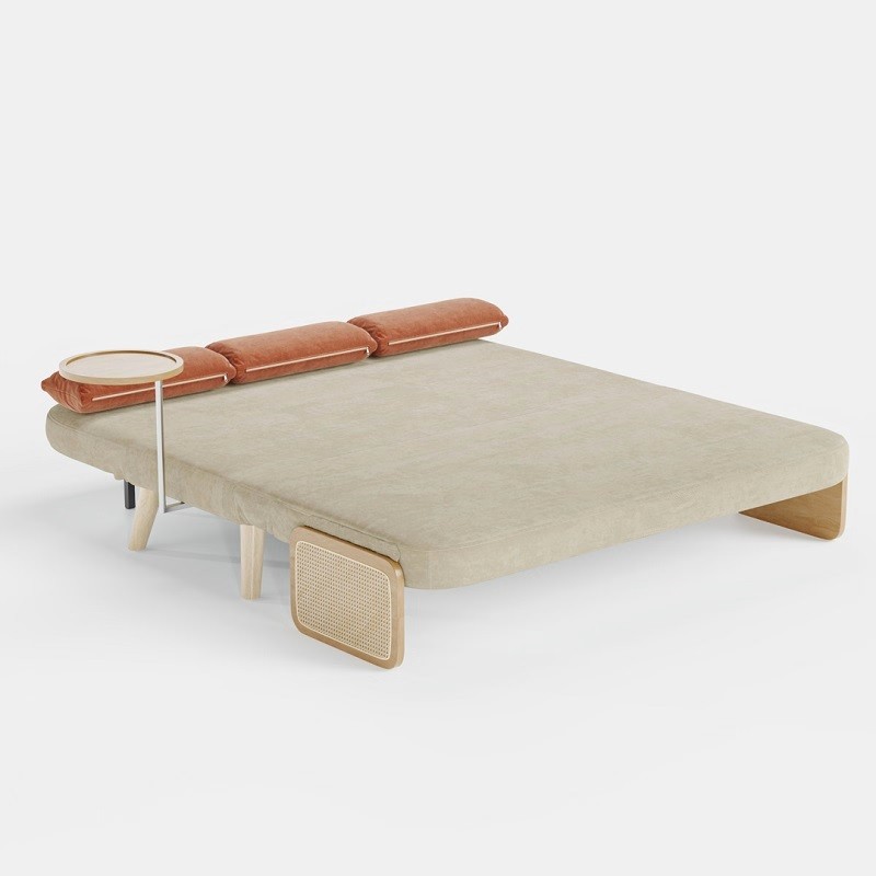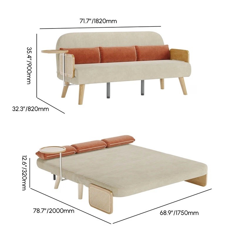 Mid-Century Beige Modern Rattan Daybed Full Folding Sofa Cum Bed, 3-Seater Convertible Sleeper Lounge Chair with Wooden Side Tray