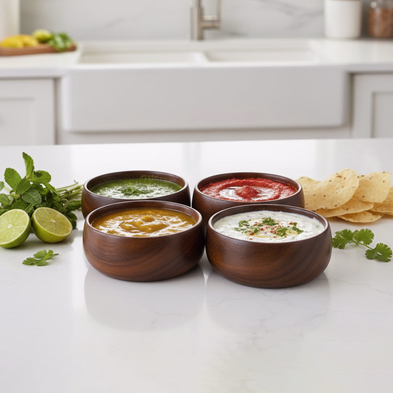 Bowl set of 4: Four bowls are the same in size and can be used to offer several chutneys, dips or dry fruits.
