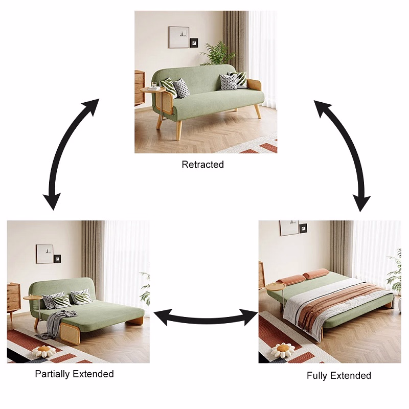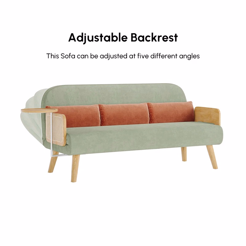 Mid-Century Green Modern Rattan Daybed Full Sofa Cum Bed, 3-Seater Folding & Adjustable Sleeper Longue Chair with Side Tray