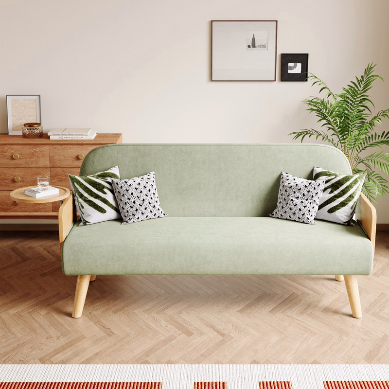 Upholstered in a rich green tone, this sofa adds character and freshness to living spaces, while the rattan detailing enhances its mid-century modern appeal. Built on a durable wooden frame, this 3 seater wooden sofa cum bed couch offers stability and long-term comfort. The integrated wooden side tray adds everyday convenience, providing space for drinks, books, or décor.