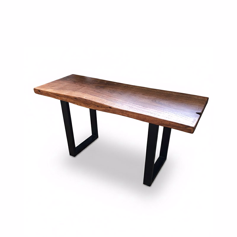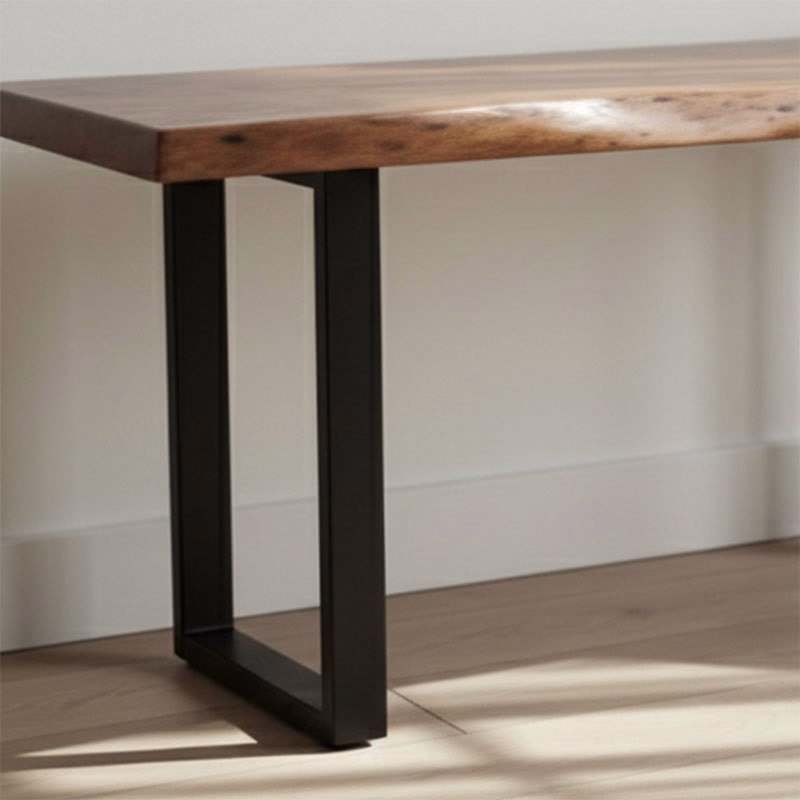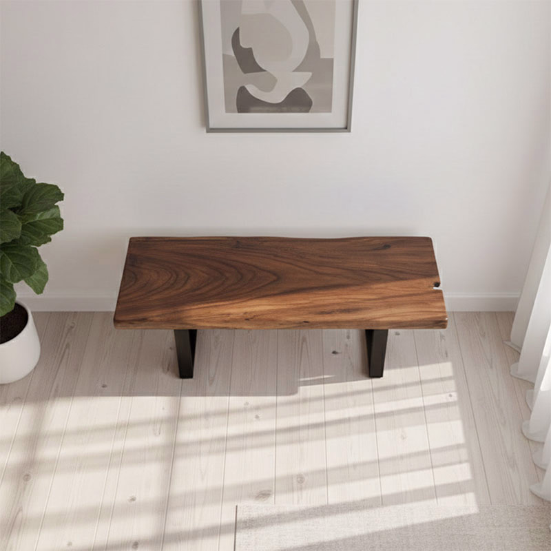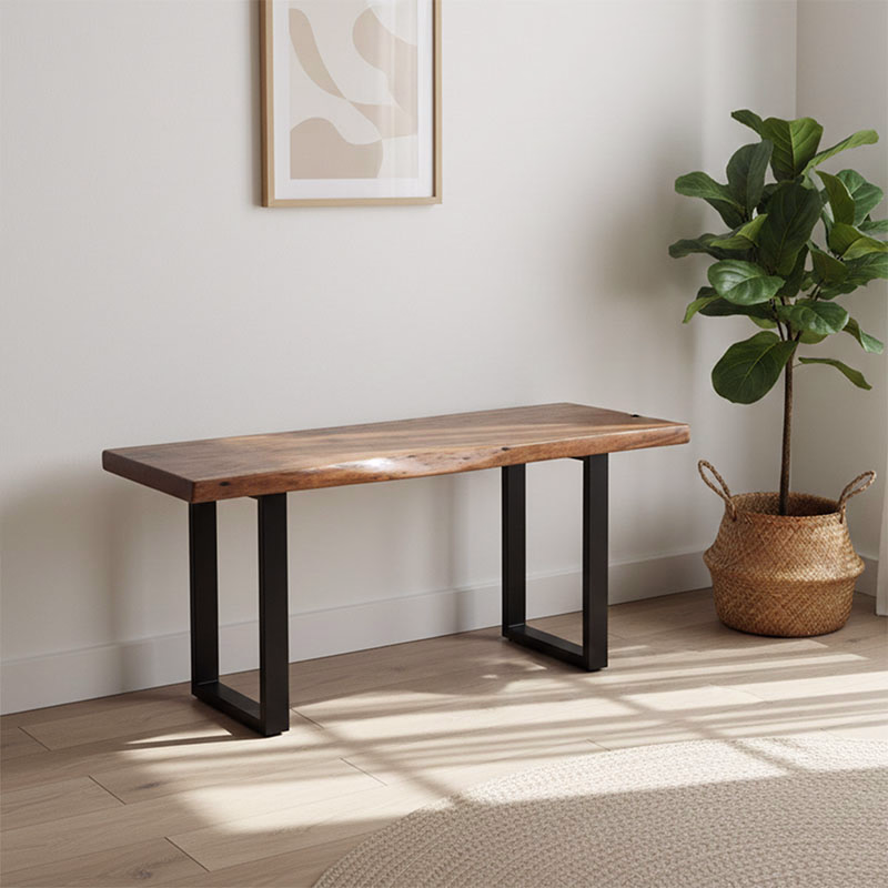 This live edge bench is crafted from solid Acacia wood and supported by a durable MS metal base frame with a black powder-coated finish.