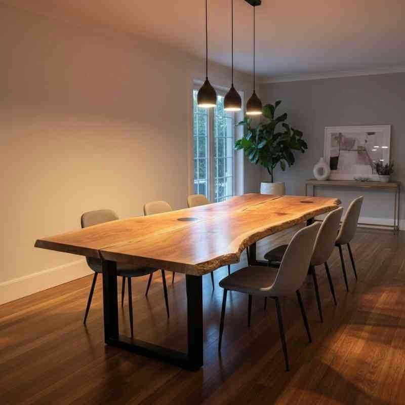 A live edge dining table is made from solid wood slabs that preserve the tree’s natural edges, showcasing organic shapes, grain patterns, and imperfections for a unique, natural appearance.