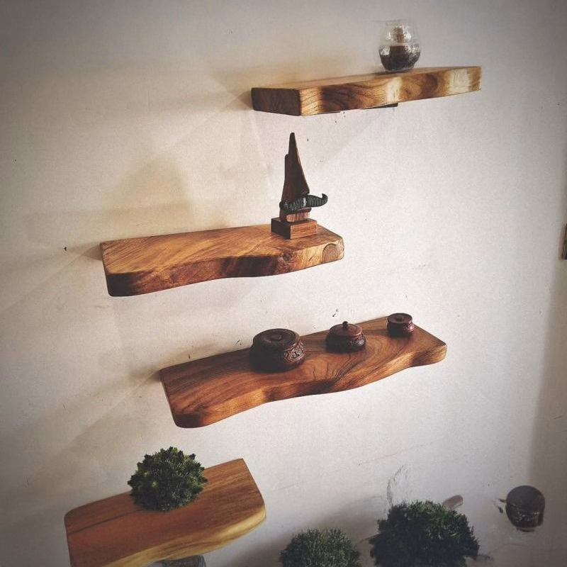 A live edge floating shelf is a wall-mounted wooden shelf that retains the natural edge of the wood, giving it a rustic and organic look. It's designed to appear as if it's "floating" without visible brackets or supports.