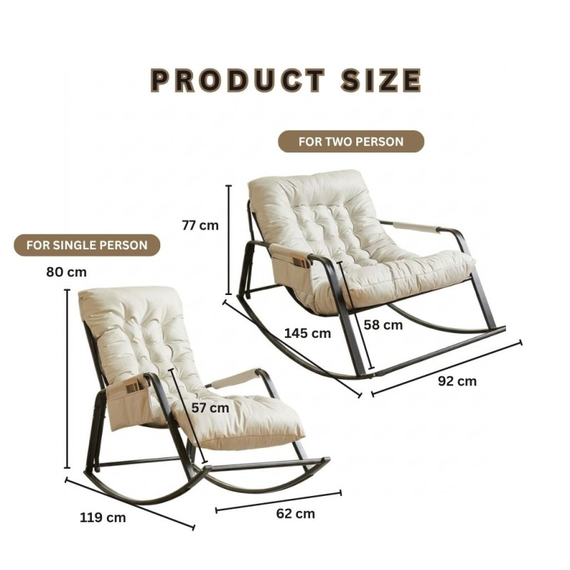 Keep your rocking chair clean by gently wiping the frame with a soft dry or slightly damp cloth. Avoid using harsh chemicals or abrasive cleaners to protect the finish and fabric. For the cushion, spot clean with mild detergent if needed. Place the chair in a covered area to prevent direct exposure to rain or excessive sunlight. Periodically check the screws and frame to ensure stability and long-lasting comfort.