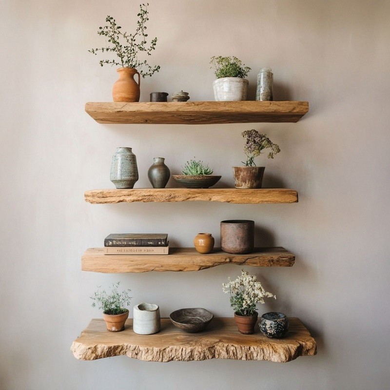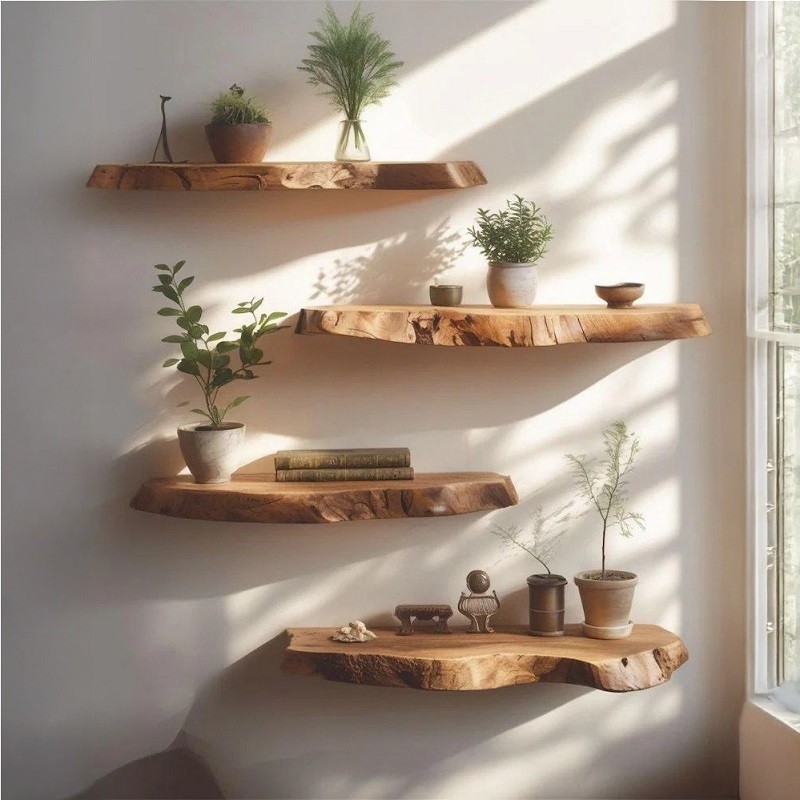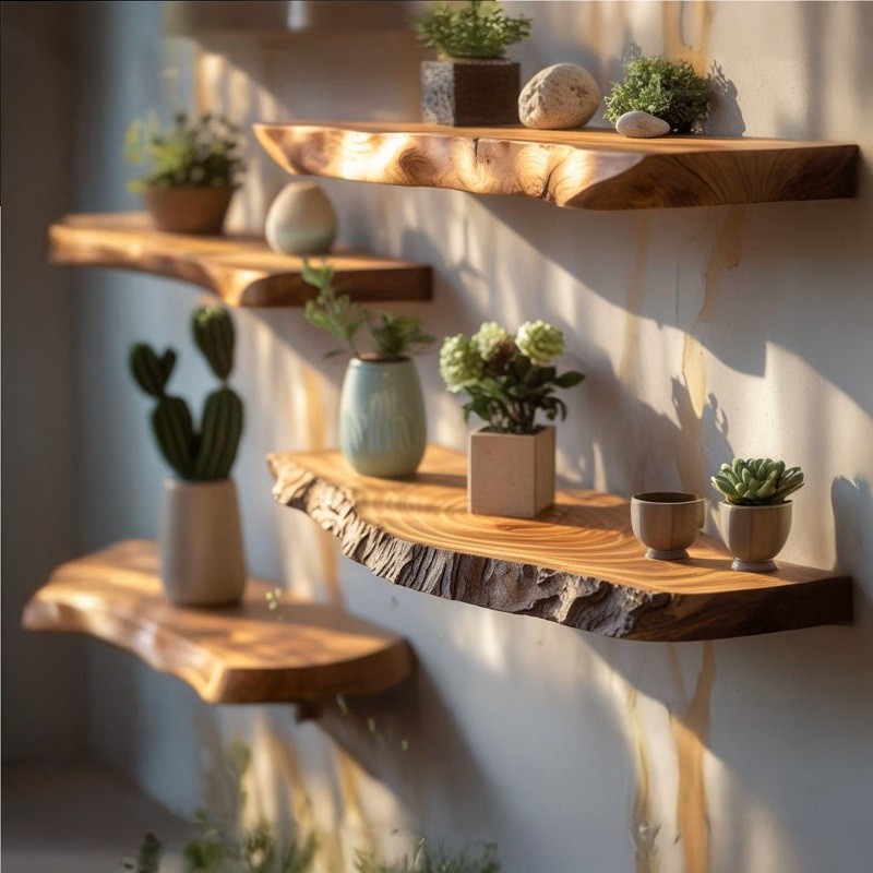 Live edge floating shelves are wooden shelves that retain the natural edge of the wood, offering a unique and organic rustic wall décor look.