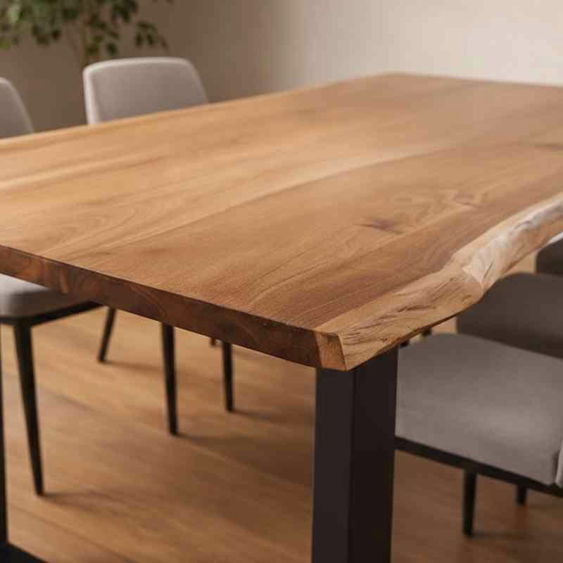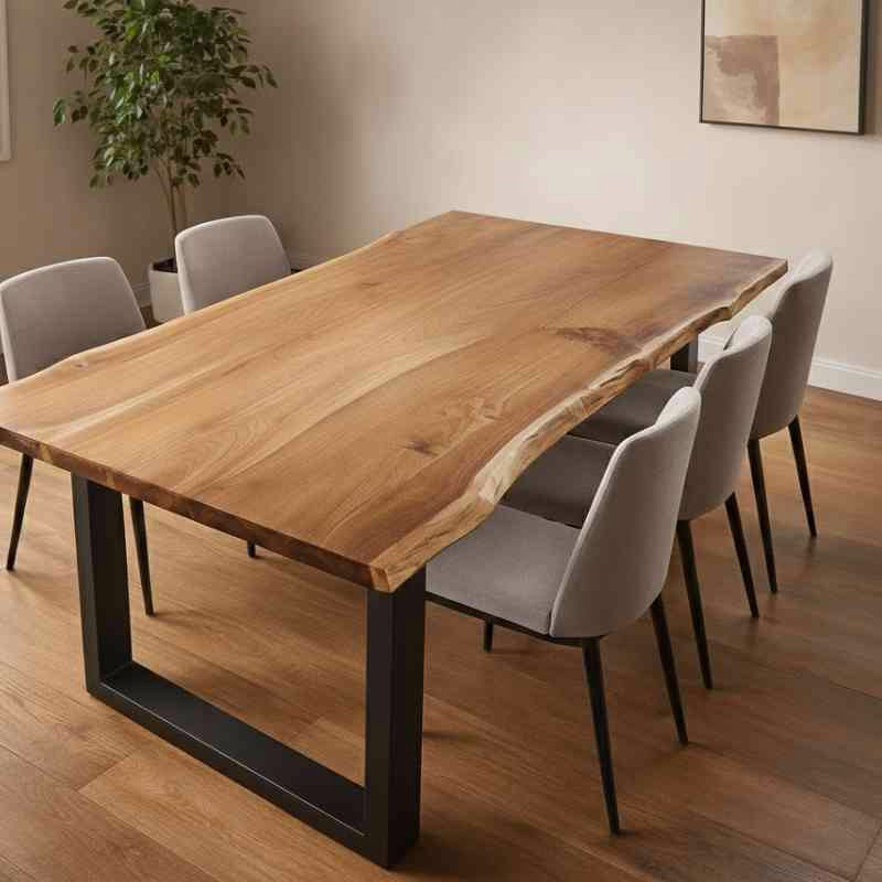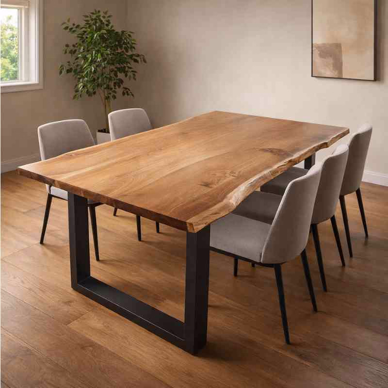 The Novellum Dining Table is crafted from premium acacia solid wood with a natural grain finish, paired with sturdy black metal legs for durability and modern style.