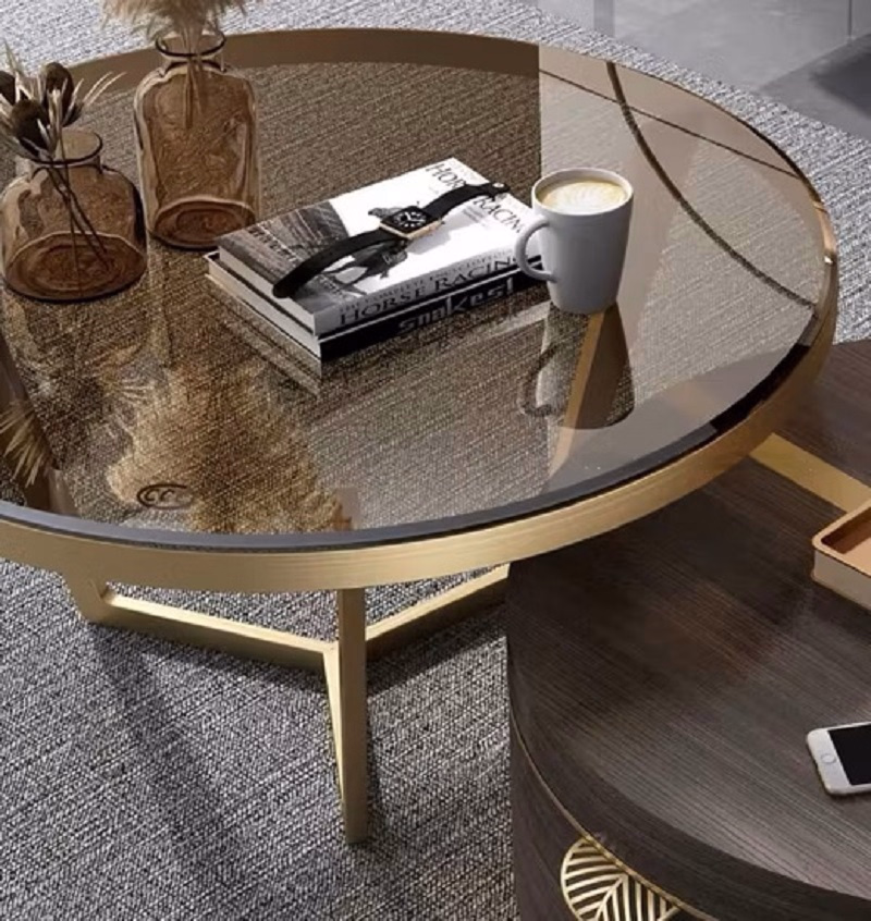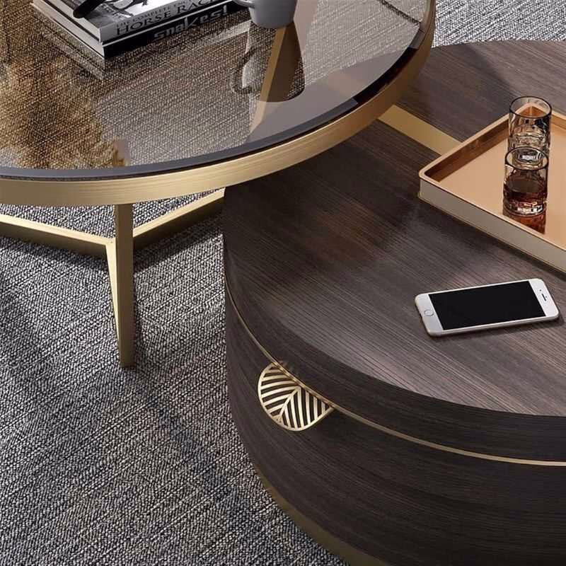 With its versatile design, this modern center table set offers ample surface space and a hidden compartment for essentials, combining style with practicality. The gold accents and rich tones make it a stunning focal point in your space.
