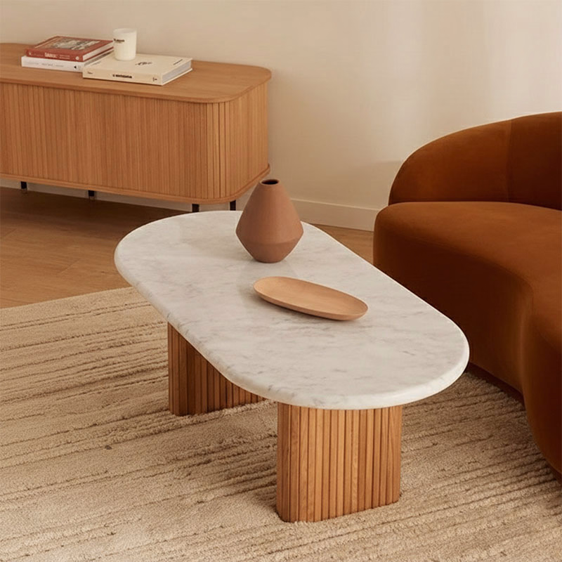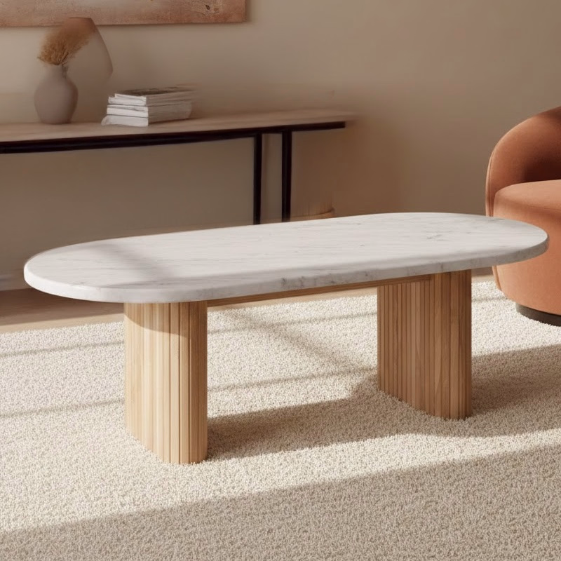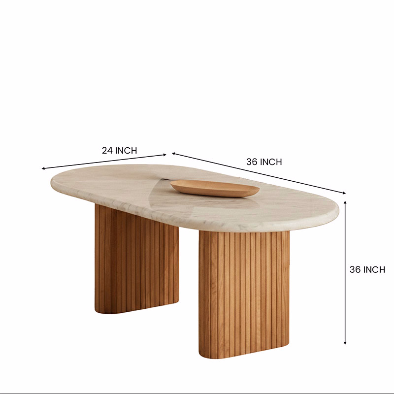 Measuring 48x24 inches, its elongated oval shape provides a spacious surface without overwhelming smaller interiors. The solid marble top is polished to perfection, creating a sleek, durable, and easy-to-maintain surface. Beneath, the vertical slatted wooden legs add texture, structure, and architectural charm, ensuring stability while doubling as a design highlight.