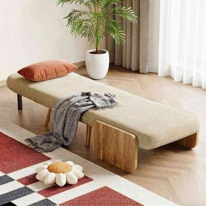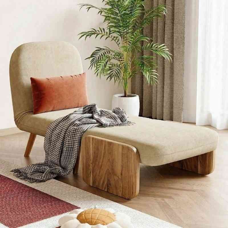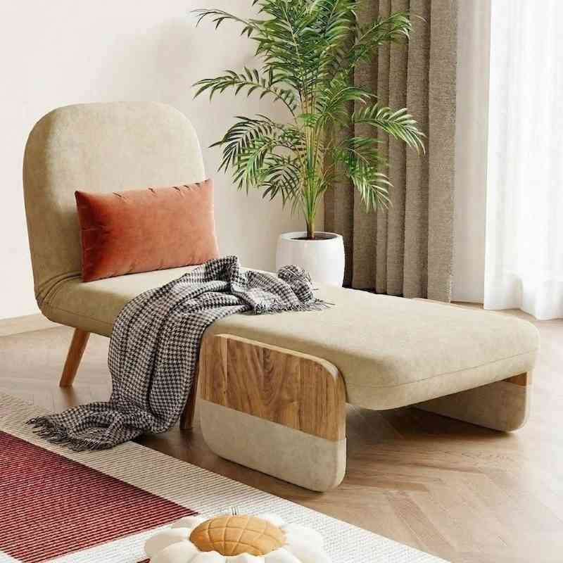 Mid-Century Beige Convertible 1-Seater Sofa Cum Bed with Solid Wood Arm Base