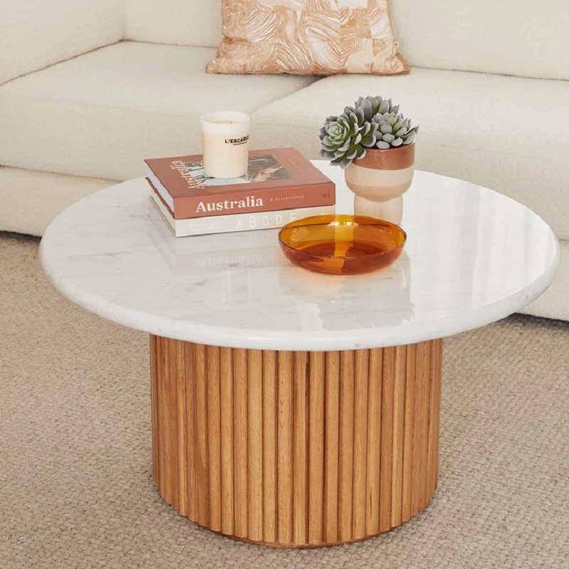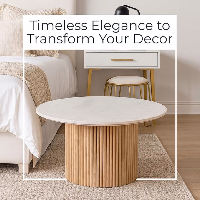 Bring timeless elegance into your home with this round marble coffee table featuring a natural fluted oak wood base. Designed to balance modern sophistication with organic warmth, this table serves as a stunning centerpiece for any living room, lounge, or studio space.