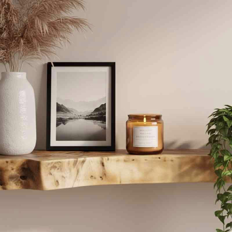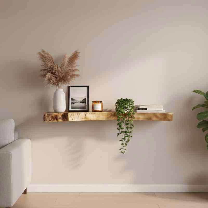 A live edge floating shelf is a wall-mounted wooden shelf that retains the natural edge of the wood, giving it a rustic and organic look. It's designed to appear as if it's "floating" without visible brackets or supports.