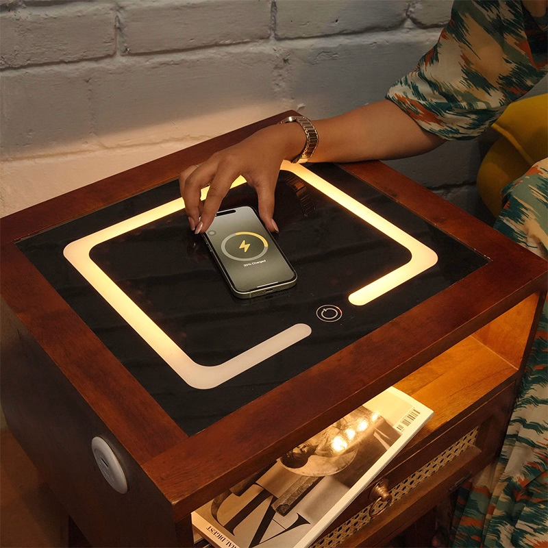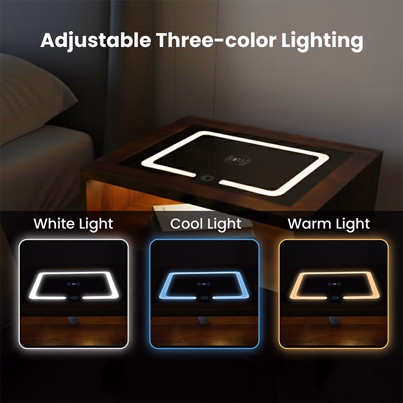 The tabletop includes a built-in wireless charging pad compatible with all Qi-enabled devices. A soft-touch panel controls a three-mode LED light, creating the perfect ambiance whether you're relaxing in the bedroom or reading in the living room.
