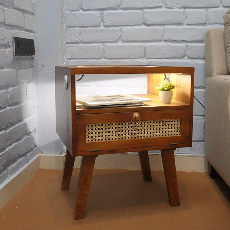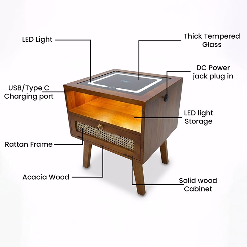 A rattan drawer and open shelf provide easy-access storage, while USB and Type-C ports keep your essential devices powered. With its clean lines, solid build, and smart features, this table suits both bedroom and living room settings, blending convenience with natural charm.