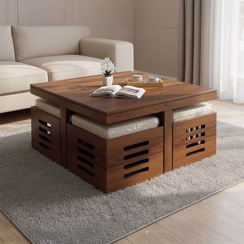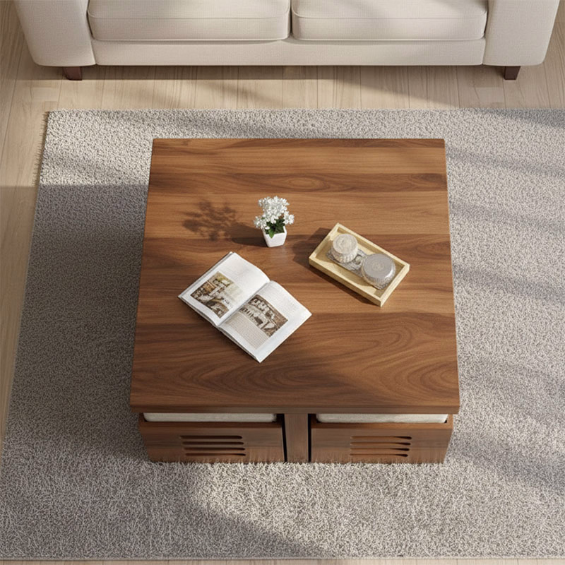 Elevate your home décor with this handcrafted solid Sheesham wood coffee table set, a perfect blend of elegance and functionality. Crafted from premium Sheesham wood furniture, this set includes a modern square coffee table with a honey finish and four cushioned stools storage coffee table style, providing built-in seating and convenient storage solutions. Ideal for living room center table furniture, the stools double as ventilated storage boxes, making it a space-saving coffee table with seating perfect for apartments, villas, or compact homes.