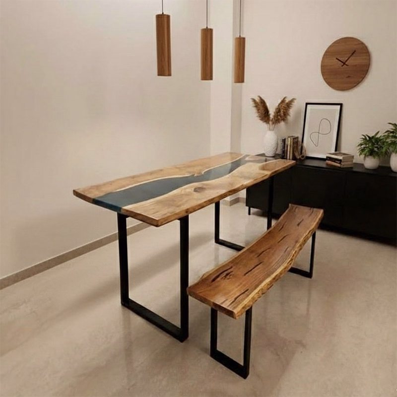 Elevate your dining experience with this handcrafted Epoxy River Dining Table paired with one matching acacia wood bench. The captivating epoxy river flows along the live-edge wood top, creating a breathtaking focal point. This setup is ideal for smaller families or minimalist spaces seeking elegance and functionality.