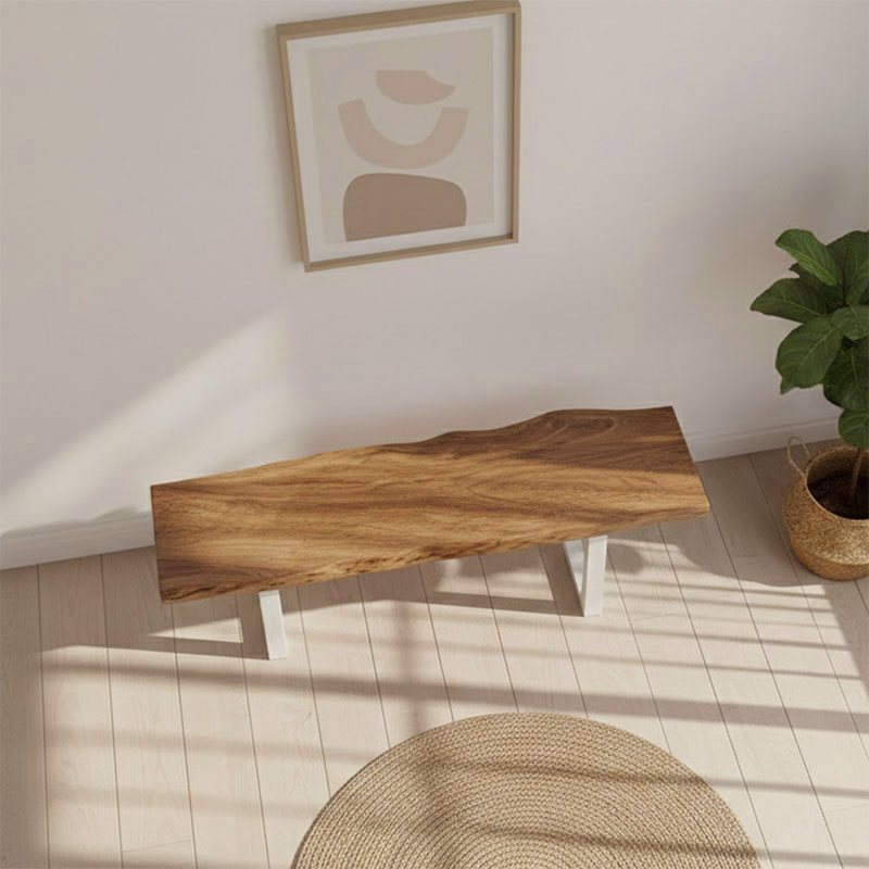 It’s a handcrafted live edge wooden bench made from solid wood slabs, preserving natural edges, grains, and knots for a unique, durable piece.