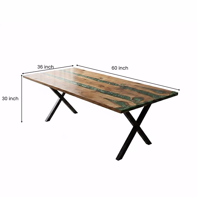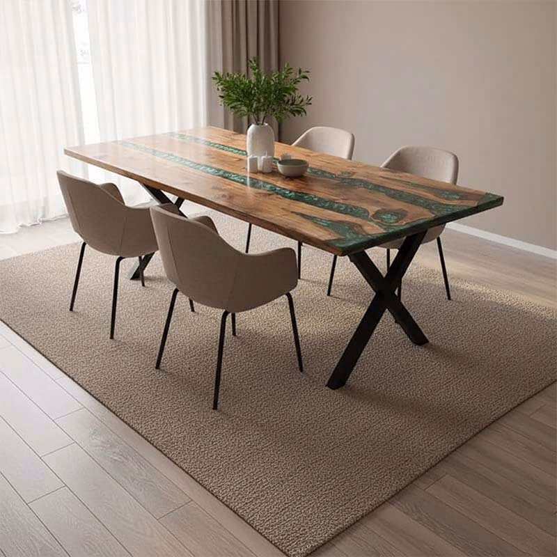 This epoxy dining table comes in a modern design with X-shaped metal legs, giving any dining room a stylish and contemporary look. The epoxy resin and solid wood composition makes it sturdy and suitable for long-term use.