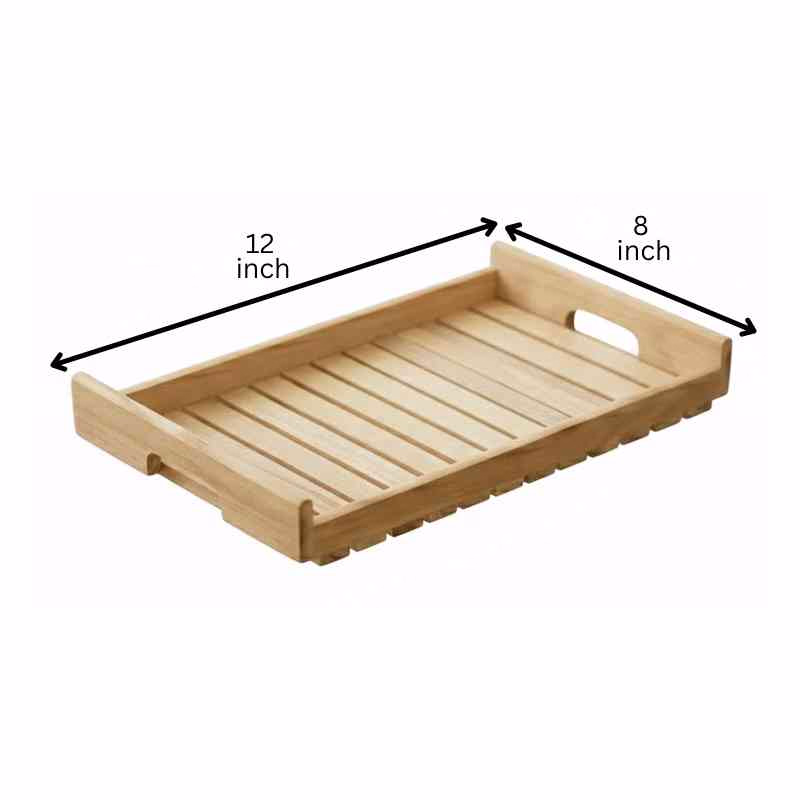 It is a rectangular wooden tray with a practical design that maximizes surface area while remaining lightweight and easy to store.