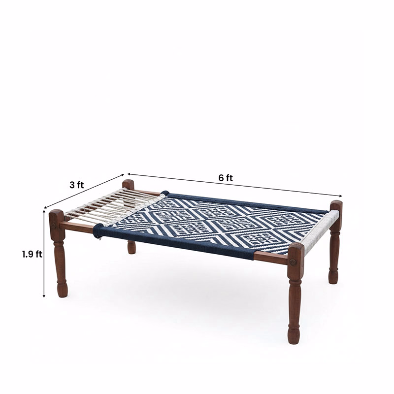 Experience the comfort and elegance of our wooden woven rope charpai which has the look of an antique piece of furniture. Made from acacia wood with a solid construction the stand is built to last, and the intricately blue and white colour woven cotton rope provides a pliant and supportive surface. Our charpai is ideal for use inside the home and in outdoor areas; it is a great solution for seating or bedding. If you are looking for a simple bed to nap or if you are looking for an art piece to beautify the home, the handcrafted wooden woven rope charpai is exactly what you need.